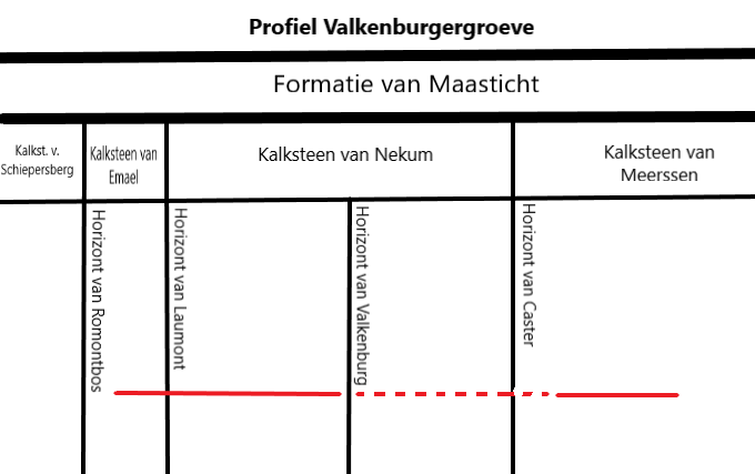 De geologische tijdschaal van de Valkenburgergroeve begint ongeveer halverwege de kalksteen van Emael en loopt door tot in de kalksteen van Meerssen zie afbeelding hier beneden. De onderste laag van de kalksteen van Emeal is goed te zien in het zogenaamde Romeinsgedeelte. Die bestaat voornamelijk uit vuursteenconcreties die typerend is vanaf 3/4 van de kalksteen van Emael. Vanaf 3/4 tot de horizont van Laumont is de beste kalksteen die je hebben voor de bouw van gebouwen, ook wel de Sibbermergel genaamd. Het meerendeel van de groeve is ontgonnen uit de kalksteen van Nekum die iets minder in kwaliteit is dan de Sibbermergel. De kalksteen van Meerssen kom je alleen tegen als je de Grote Pijp op gaat deze is in de afbeelding een rode stippellijn.